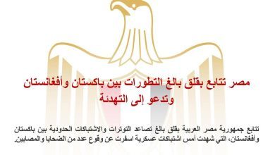 - مصر تتابع بقلق بالغ التطورات بين باكستان وأفغانستان وتدعو إلى التهدئة