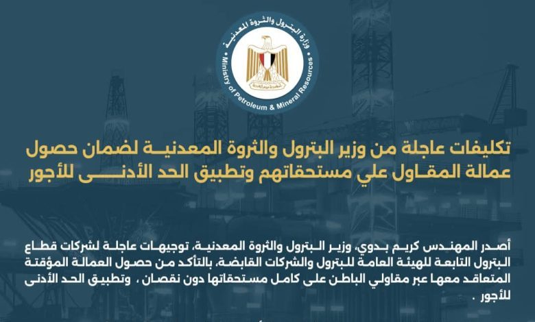 تكليفات عاجلة من وزير البترول والثروة المعدنية لضمان حصول عمالة المقاول على مستحقاتهم وتطبيق الحد الأدنى للأجور