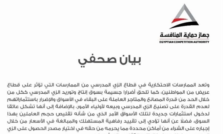 قرر جهاز حماية المنافسة ومنع الممارسات الاحتكارية ثبوت مخالفة 12 مدرسة لقيامهم بممارسات احتكارية في سوق توزيع الزي المدرسي بالمخالفة لأحكام المادة 8 من قانون حماية المنافسة ومنع الممارسات الاحتكارية رقم 3 لسنة 2005.