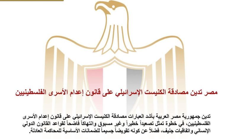 تدين جمهورية مصر العربية بأشد العبارات مصادقة الكنيست الإسرائيلي على قانون إعدام الأسرى الفلسطينيين، في خطوة تمثل تصعيداً خطيراً وغير مسبوق وانتهاكاً فاضحاً لقواعد القانون الدولي الإنساني واتفاقيات جنيف، فضلاً عن كونه تقويضاً جسيماً للضمانات الأساسية للمحاكمة العادلة.