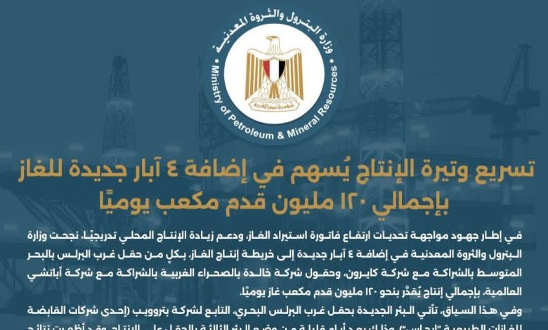 في إطار جهود مواجهة تحديات ارتفاع فاتورة استيراد الغاز، ودعم زيادة الإنتاج المحلي تدريجيًا، نجحت وزارة البترول والثروة المعدنية في إضافة 4 آبار جديدة إلى خريطة إنتاج الغاز، بكلٍ من حقل غرب البرلس بالبحر المتوسط بالشراكة مع شركة كايرون، وحقول شركة خالدة بالصحراء الغربية بالشراكة مع شركة أباتشي العالمية، بإجمالي إنتاج يُقدَّر بنحو 120 مليون قدم مكعب غاز يوميًا.