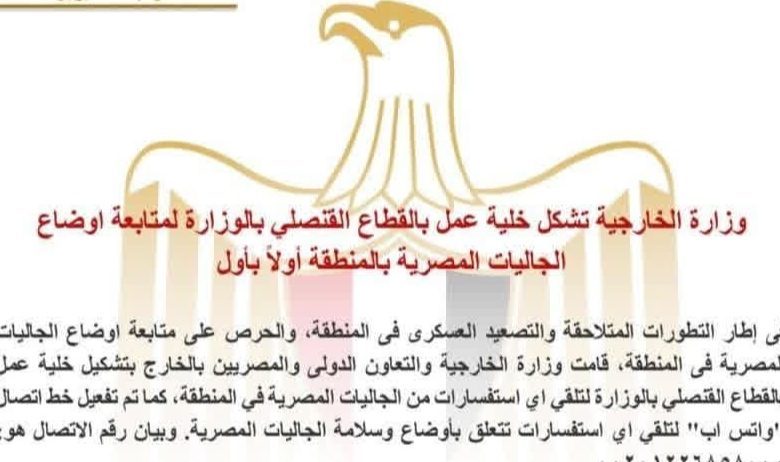 فى إطار التطورات المتلاحقة والتصعيد العسكرى فى المنطقة، والحرص على متابعة اوضاع الجاليات المصرية فى المنطقة، قامت وزارة الخارجية والتعاون الدولى والمصريين بالخارج بتشكيل خلية عمل بالقطاع القنصلي بالوزارة لتلقي اي استفسارات من الجاليات المصرية في المنطقة، كما تم تفعيل خط اتصال “واتس اب” لتلقي اي استفسارات تتعلق بأوضاع وسلامة الجاليات المصرية. وبيان رقم الاتصال هو: 00201226858000