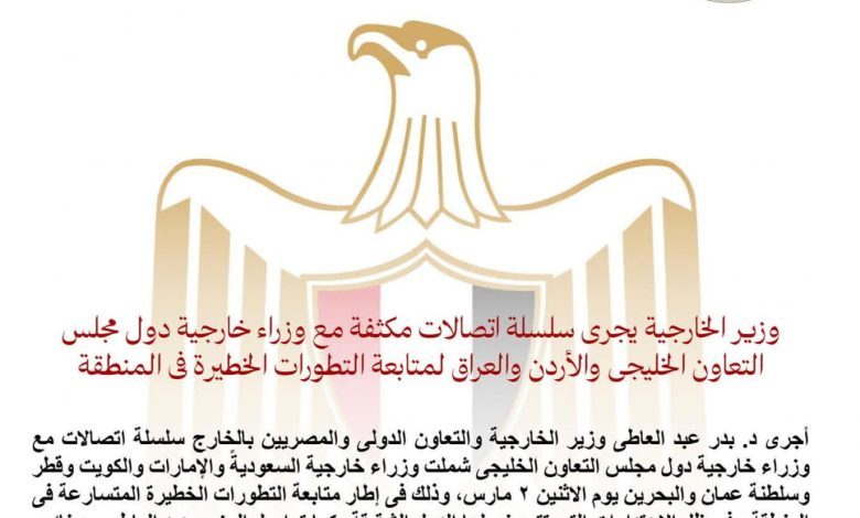 أجرى د. بدر عبد العاطى وزير الخارجية والتعاون الدولى والمصريين بالخارج سلسلة اتصالات مع وزراء خارجية دول مجلس التعاون الخليجى شملت وزراء خارجية السعوديةً والإمارات والكويت وقطر وسلطنة عمان والبحرين يوم الاثنين ٢ مارس، وذلك فى إطار متابعة التطورات الخطيرة المتسارعة فى المنطقة وفي ظل الاعتداءات التي تتعرض لها الدول الشقيقة، كما تواصل الوزير عبد العاطي مع نائبي رئيسي وزراء ووزيري خارجية الأردن والعراق الشقيقين.